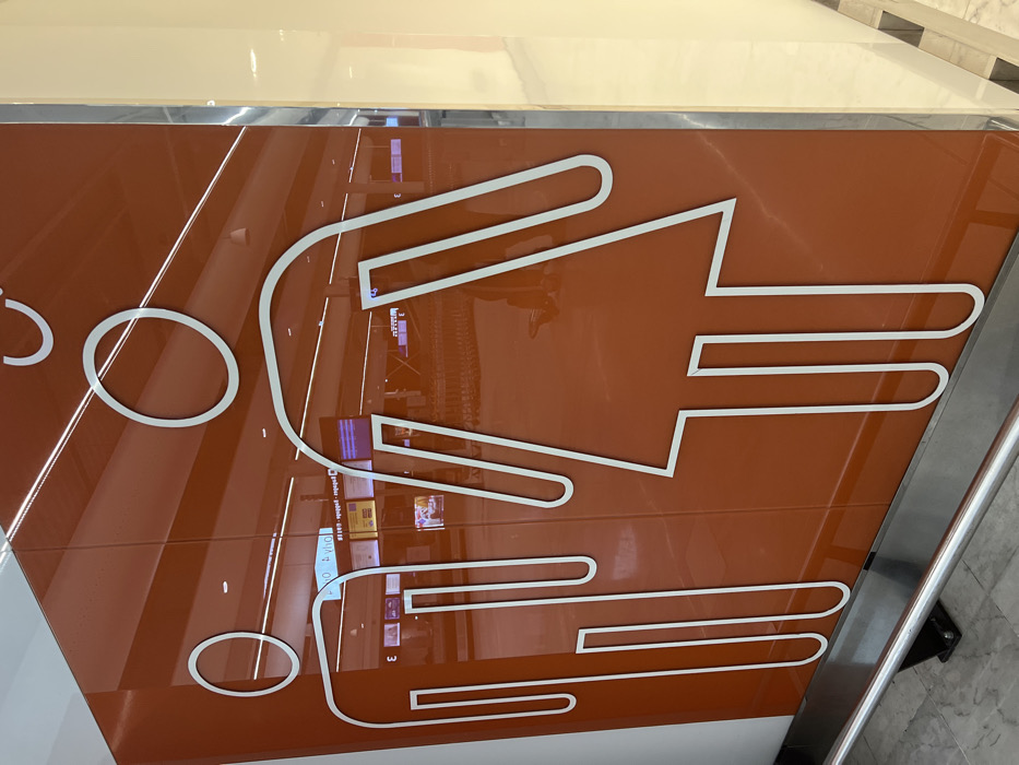 An eye-level shot depicts a restroom sign with minimalist male and female figures. The sign features an orange background, bright white outlines, and a metallic silver trim. The reflections show a busy interior, including screens displaying information and individuals walking by. The sign is glossy, adding to the reflective quality.