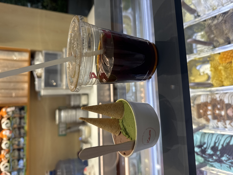 A clear plastic cup of dark liquid with a straw sits above a white cup of gelato