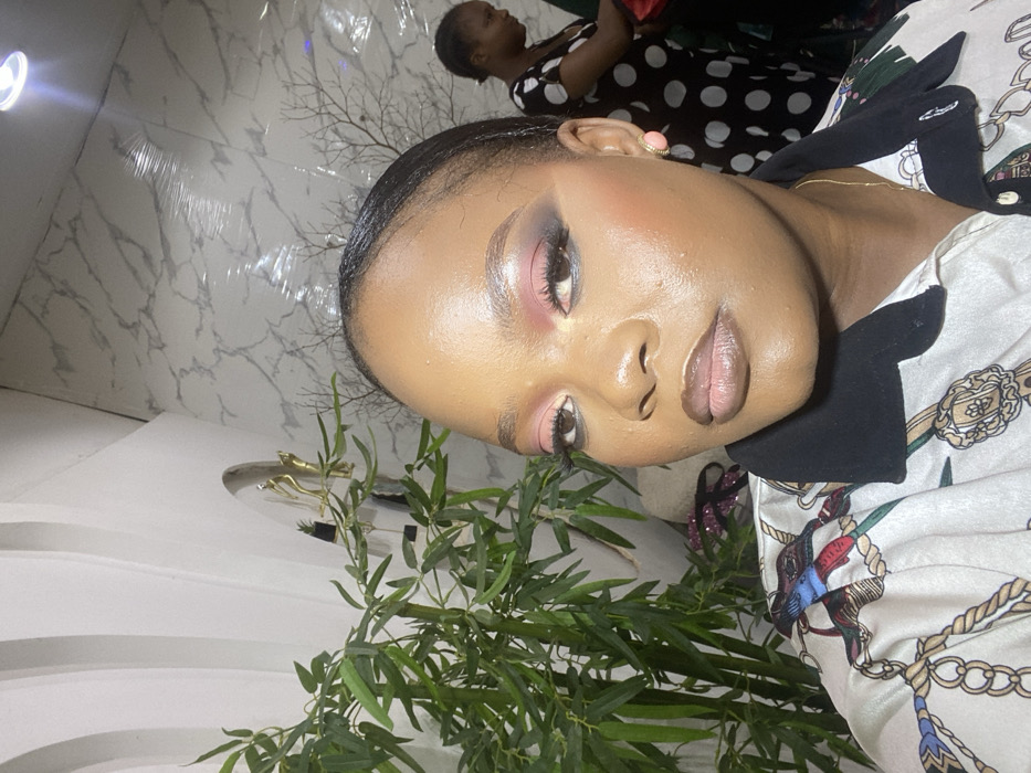 This image depicts an indoor scene in Nyanya, Nigeria. In the foreground, a woman with dark skin is positioned centrally, facing forward. She has dark hair pulled back and is wearing extensive makeup, including pink and dark eyeshadow, highlighted cheekbones and nose, and pinkish-brown lipstick. She wears a collared shirt with a black collar and a light-colored body featuring a gold chain-link pattern with blue, red, and green accents. A small, light pink or coral stud earring is visible in her right ear, along with a thin gold chain around her neck. To her immediate left, a tall, green artificial plant, resembling bamboo, stands vertically. The background features white walls with a grey marble pattern. A gold-toned metallic decorative piece is mounted on the wall behind the plant. Further to the right, a bare, stylized branch-like wall decoration is visible. Sections of the wall and ceiling appear to have a glossy finish or are covered in a reflective material. A bright white ceiling light fixture is visible in the upper right quadrant. In the mid-ground, to the right of the primary subject, another woman is partially visible, wearing a dark garment with white polka dots. Her head is turned slightly away from the camera, and she appears to be looking downwards. The overall environment suggests a well-lit, decorated interior space.