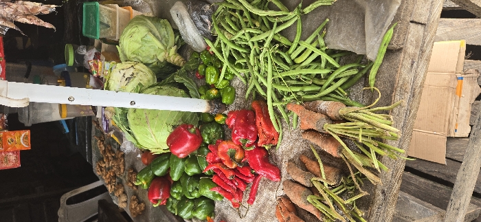 This image depicts a market stall in Uyo, Nigeria, laden with fresh produce. The display is situated on a wooden surface, partially covered by a light-colored fabric. In the foreground, multiple bunches of carrots with visible green tops and residual soil are arranged on the left. Adjacent to the carrots on the right, a substantial pile of fresh green beans occupies the lower-right quadrant. Moving towards the mid-ground, a vibrant collection of bell peppers and chili peppers is visible. Piles of green bell peppers are prominent on the left, intermingled with red bell peppers and several elongated red chili peppers. Further right, smaller green peppers, possibly hot peppers, are grouped. Dominating the center are several large, pale green cabbages. In the upper-left, numerous pieces of ginger root are spread across the stall surface. The background features various market elements: a partial white plastic chair on the far left, hanging sachets of packaged goods (likely spices or seasonings) in the upper center, and clear and green plastic containers on the upper right. A distinctive white vertical pole, secured with visible screws, stands centrally, extending from mid-ground to the top of the frame. Below the wooden stall, cardboard boxes are visible, suggesting either storage or part of the stall's support structure. No individuals are present within the frame.