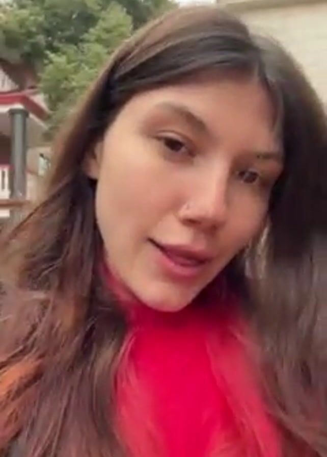 woman outdoors. She has long brown hair with red highlights at the ends. She is wearing a bright red top under a black jacket. The background includes a tree, a building with white and red details, and a car. The woman looks directly at the camera and speaks, greeting the viewer. She asks, "How are you?" She smiles and appears to be in a residential area.