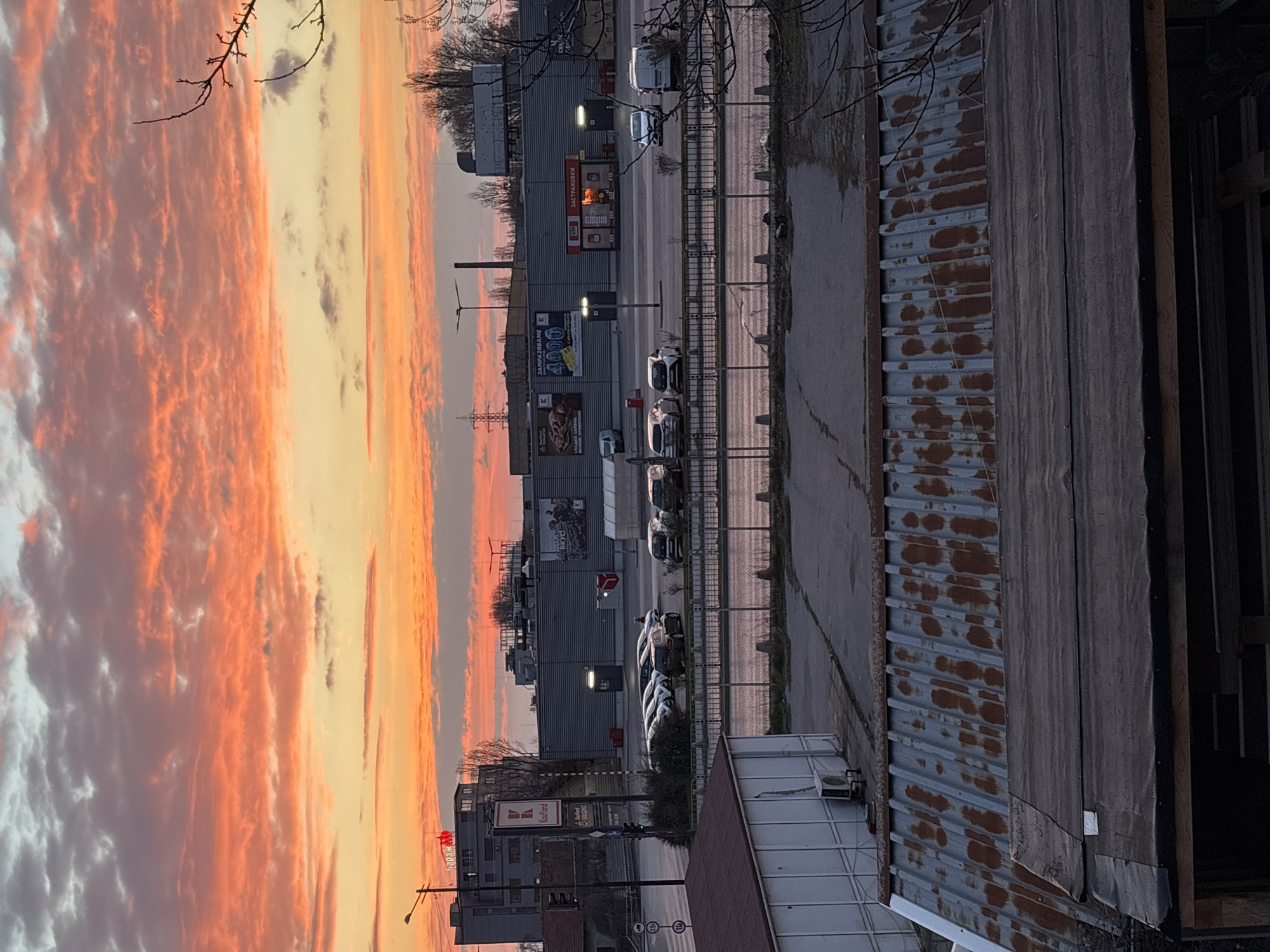 The image depicts an outdoor urban commercial and industrial scene at sunset in Sofia, Bulgaria, specifically identifiable near a Kaufland hypermarket and an area associated with "Бараж" (Barazh). The upper third of the frame is dominated by a vibrant sunset sky featuring numerous horizontally elongated clouds saturated with intense orange, red, and yellow hues, transitioning to lighter tones closer to the horizon. The foreground presents a heavily rusted, corrugated metal roof with prominent orange-brown discoloration, positioned above a darker, flat roof covered in a black, textured material. Partially visible beneath these roofs are components of a shed or similar structure. To the left of these roofs stands a white, rectangular single-story building with an external air conditioning unit. The mid-ground features a large, dark grey asphalt surface, indicative of a parking lot or access road, appearing damp or reflective in areas. A metal fence with horizontal bars separates sections of this paved area. Bare tree branches, devoid of leaves, extend into the frame from the far right. The background centers on a large, grey commercial building, likely a hypermarket, characterized by industrial cladding and multiple bay doors. A prominent red "Kaufland" sign with Cyrillic text is visible on a pole in front of this building, along with traffic signs displaying speed limits of 25 and 10. The building's facade features large banners, one advertising "ЗАМРАЗЯВАМЕ 4000" (We freeze 4000) with product images, and another partially obscured. A small, red kiosk-like structure labeled "SDI ЗАСТРАХОВКИ" (SDI Insurances) is positioned in front of the main building. Approximately 10-15 stationary vehicles, predominantly light-colored cars and one white van, are parked in the asphalt lot. Further to the left, a multi-story grey building with a red neon sign displaying "бараж" (Barazh) and a crown logo is visible. Leafless trees are scattered behind the commercial structures. In the distant background, against the sunset, an industrial chimney and an electricity transmission pylon are discernible. Streetlights, some illuminated, are dispersed throughout the scene. No individuals are clearly identifiable.