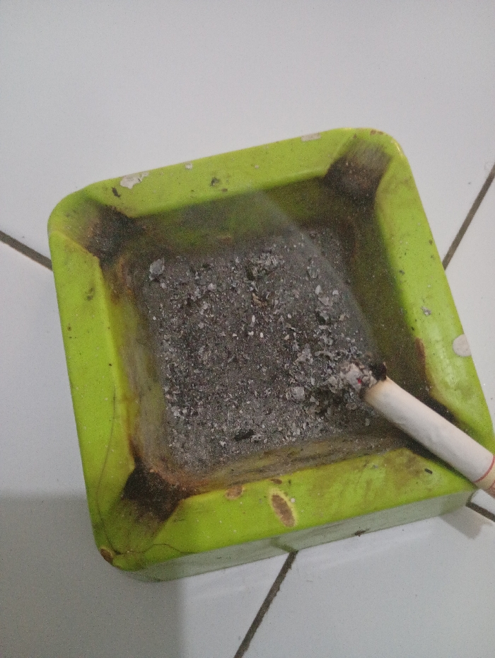 - "A green, square ashtray filled with gray ash sits on a white tiled surface" by FM-fe12Z2, licensed under CC BY 4.0