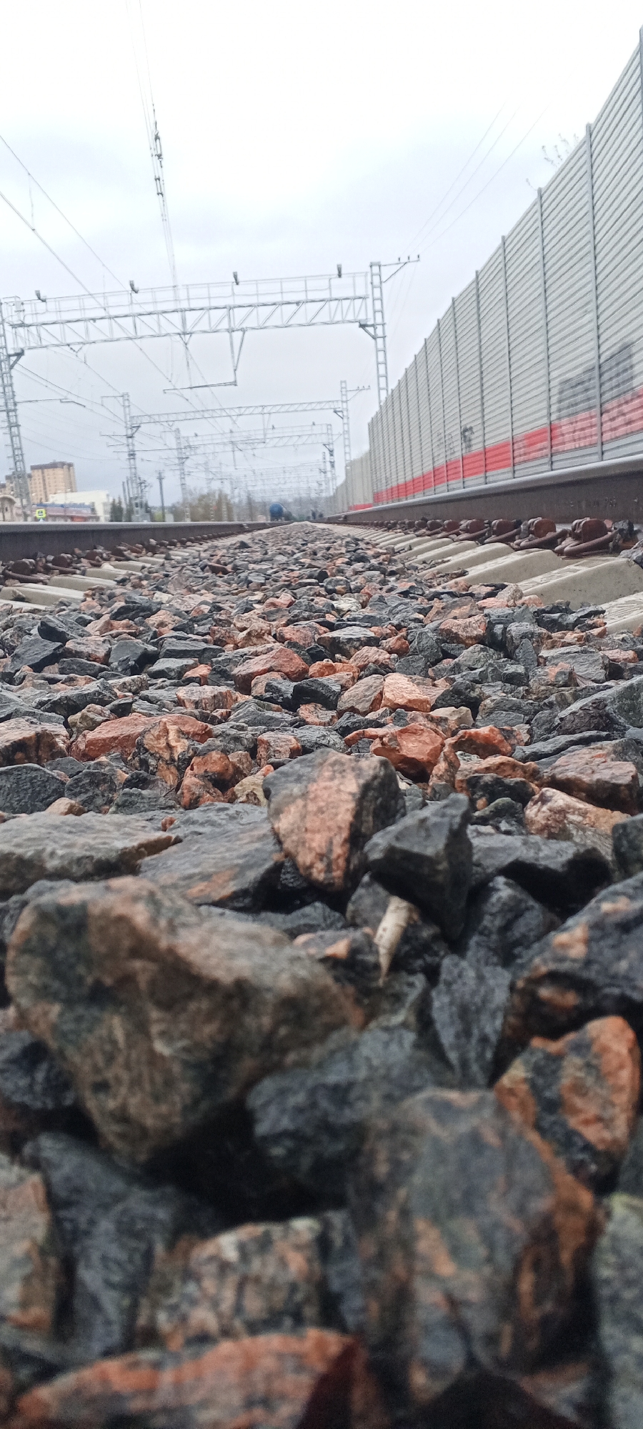 A ground-level, low-angle shot of a railway track in Dmitrov, Russia. The foreground is dominated by track ballast rocks in varying shades of gray and red, occupying most of the frame. The railway tracks run horizontally across the middle of the image, receding into the distance. Concrete sleepers support the tracks. A gray sound barrier wall runs parallel to the tracks on the right side of the image. Overhead power lines and gantries stretch above the tracks. In the far background, obscured by distance and overcast lighting, are indistinct buildings and a cloudy sky. The overall scene has a cold and industrial feel, possibly after rain.