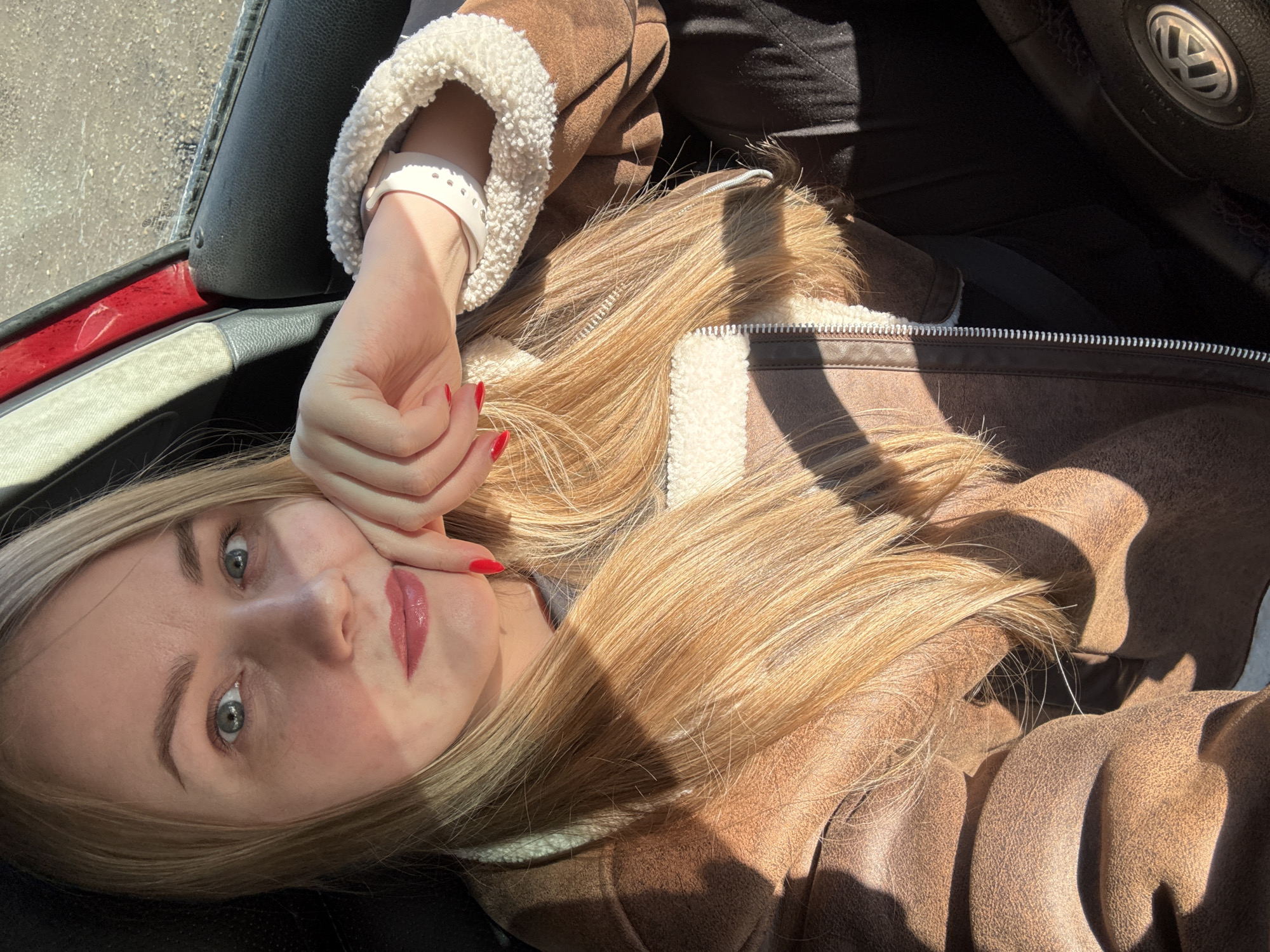 The scene, located in Chaikovsky, Russia, depicts a female individual seated within a vehicle. The individual has light blonde hair, blue-green eyes, and light pink lipstick. Her left hand, adorned with red nail polish, rests near her chin as she looks directly towards the camera. She is wearing a brown faux-suede jacket with cream-colored fleece trim over a light-colored garment. A white smart watch is visible on her left wrist. The vehicle interior includes a visible dark steering wheel with a Volkswagen logo, a dark seatbelt, and a side door panel with red accents. Strong direct sunlight enters the vehicle, casting distinct shadows across the individual and interior surfaces.