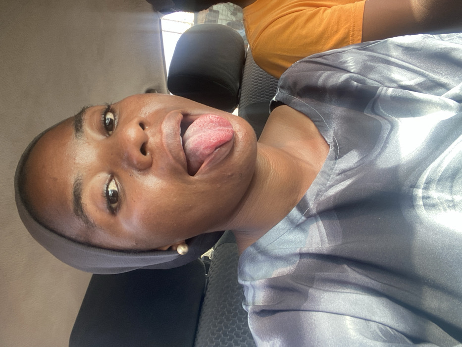 The image displays a young Black female positioned centrally in the interior of a vehicle, located in the city of Nagazi, Nigeria. She is looking directly at the camera with her mouth open and a pink, textured tongue fully extended. Her left ear is visible, adorned with a spherical, light-colored stud earring. She wears a grey headscarf and a grey short-sleeved top featuring a subtle, abstract lighter-toned pattern. To her right, partially visible, is the shoulder and upper arm of another individual wearing a bright orange short-sleeved shirt. The background consists of grey patterned fabric consistent with car seat upholstery and a light-colored vehicle ceiling, indicating the scene takes place within an automotive setting during daylight.