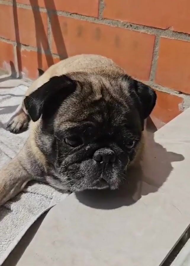 A close up shot captures a tan pug dog, its black face distinct against its lighter coat. It lies prone on a gray towel, which is partially situated on a tile surface. The brick wall provides a backdrop to the scene, casting a long shadow across the frame. Sunlight illuminates the dog's face and the surrounding area, highlighting the brick and towel textures. The camera remains still, providing a stationary perspective of the dog.
