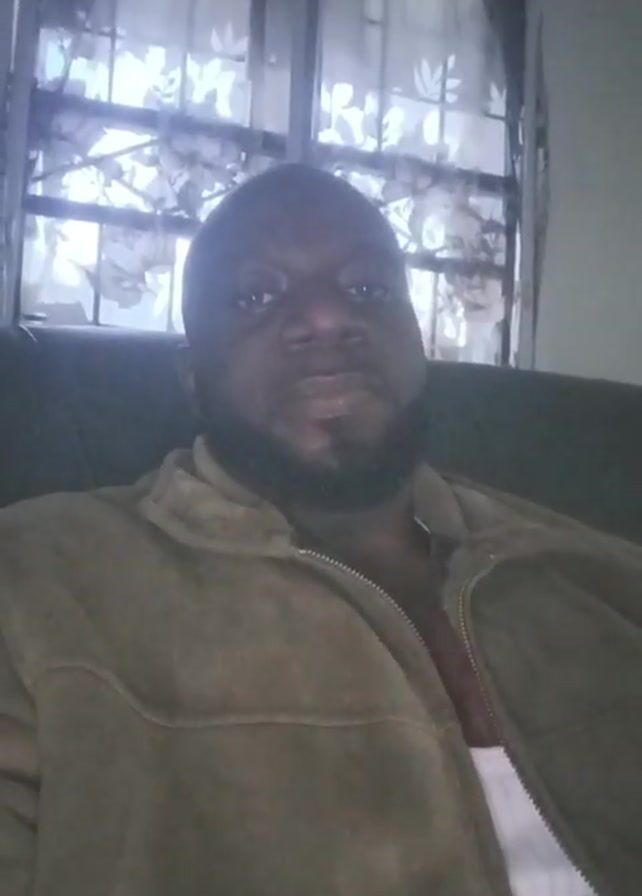 A medium shot shows a person seated indoors, likely on a couch, with a window in the background. The individual, a man with a dark complexion, has a shaved head and a full beard. He is wearing a tan jacket over a white t-shirt, and the jacket is partially unzipped. The window behind him has a decorative pattern or sheer curtain. The lighting appears to be somewhat dim. The man is looking directly at the camera with a neutral expression. There are no visible actions or interactions.