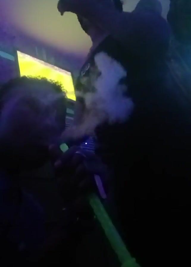 Two people are inside a dark room with colorful lights. One person is smoking from a green hookah. They blow out smoke in the other person's direction. A television screen is visible in the background.