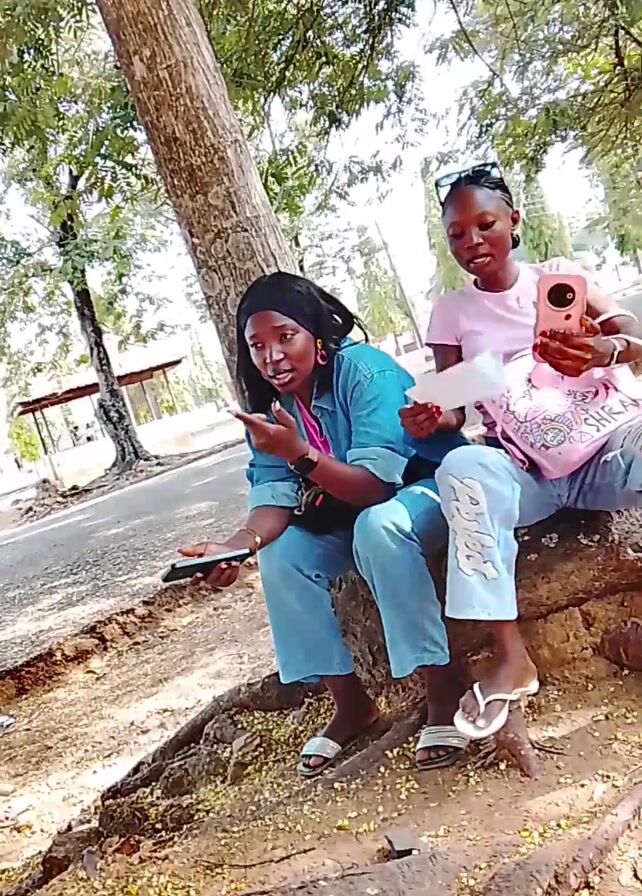 Two women sit next to each other on the exposed roots of a large tree in a park. One woman wears a blue denim outfit and a black head covering; she holds a smartphone in her hand and gestures with her index finger. The other woman wears a pink shirt and light blue jeans, holding a pink smartphone. There's a pink bag on her lap. Both are wearing sandals. They appear to be engaged in a conversation, looking at each other occasionally. The environment is sunny with trees and a paved pathway in the background.