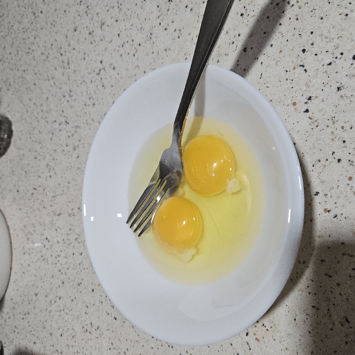 An overhead view captures a white ceramic bowl containing two raw eggs, unbroken yolks submerged in their whites, resting on a light speckled countertop. A silver metal fork lies diagonally across the bowl, its tines partially submerged in the egg whites, with the handle extending towards the right. The countertop features irregular dark flecks on a beige background. In the out-of-focus upper background, a portion of a white ceramic item and a dark, cylindrical object are partially visible. The scene is located indoors, likely a kitchen, in Unknown, Unknown.