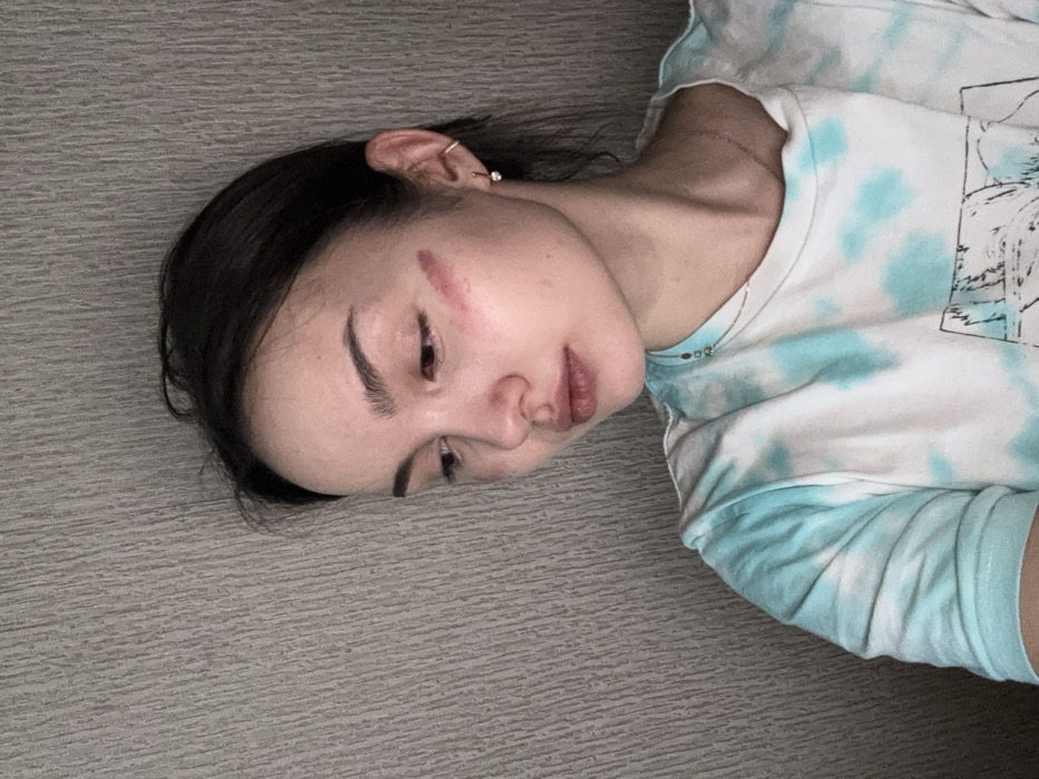 The image displays a female individual situated in Bayronovka, Russia. The subject has dark hair and light complexion. A distinct reddish-purple linear mark is present on her left cheekbone, accompanied by a fainter reddish discoloration below her left eye and around the nasal and oral regions. She is wearing a white t-shirt with a blue tie-dye pattern, a thin chain necklace adorned with small beads, and two earrings in her left ear: a small stud in the lobe and a metallic cuff on the upper cartilage. Her gaze is directed downwards and slightly to her left. The background features a textured wall with vertical linear patterns in a neutral grey tone. The scene is illuminated by indoor lighting.