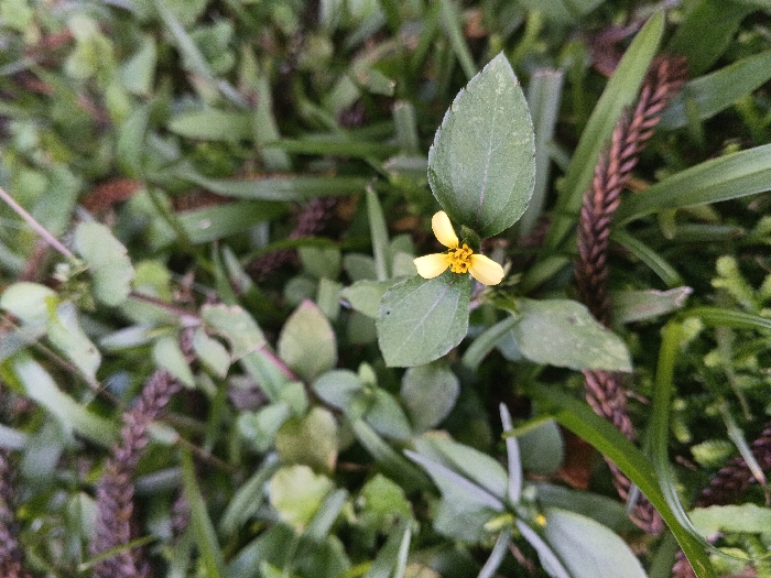The scene depicts a macro-level view of uncultivated ground vegetation in Stueng Saen, Cambodia. Centrally positioned is a small herbaceous plant, approximately 5-7 cm in height, bearing light green, ovate leaves. A single yellow flower, possessing four distinct petals and a darker yellow central cluster of reproductive organs, is prominent on this plant. Surrounding the central plant is a dense array of various green foliage, including slender blades of grass and broader-leafed plants. To the upper right of the yellow flower, a reddish-brown inflorescence with a textured, braided appearance extends vertically. The background consists of out-of-focus green plant material. No human figures, fauna, or artificial objects are present in the frame. The lighting is consistent with ambient daylight.