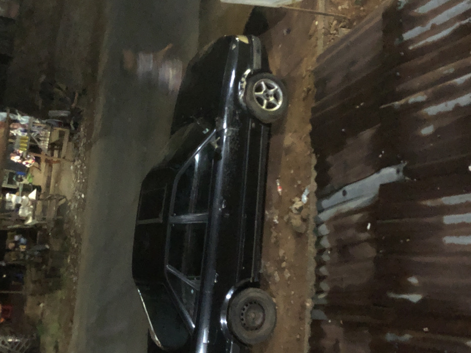 A black sedan is parked on a paved street next to a corrugated metal wall. The car's wheels are visible, one with a hubcap featuring a five-star design. The street appears to be in a congested area with signs of a small shop or market visible in the background on the left. The photograph appears to have been taken at night or in low light, casting shadows and obscuring details.
