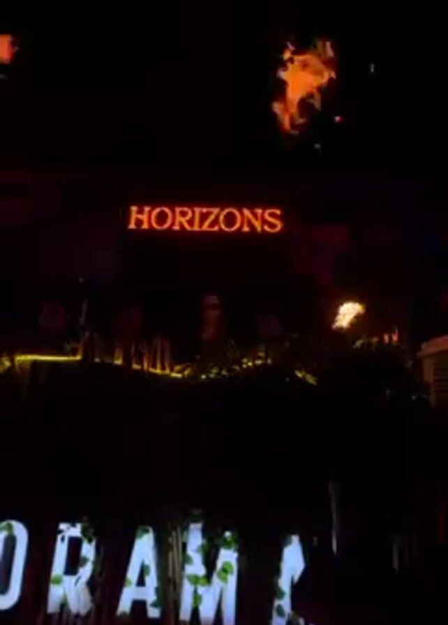 DJ booth at a club called Horizons. The DJ booth is decorated with greenery. The name "HORIZONS" is illuminated in red neon lights. Below that, the word "ORAMA" is illuminated in white lights. Four DJs are visible in the booth, though they are mostly silhouetted. Blue and red lights flash in the background. Music is playing.