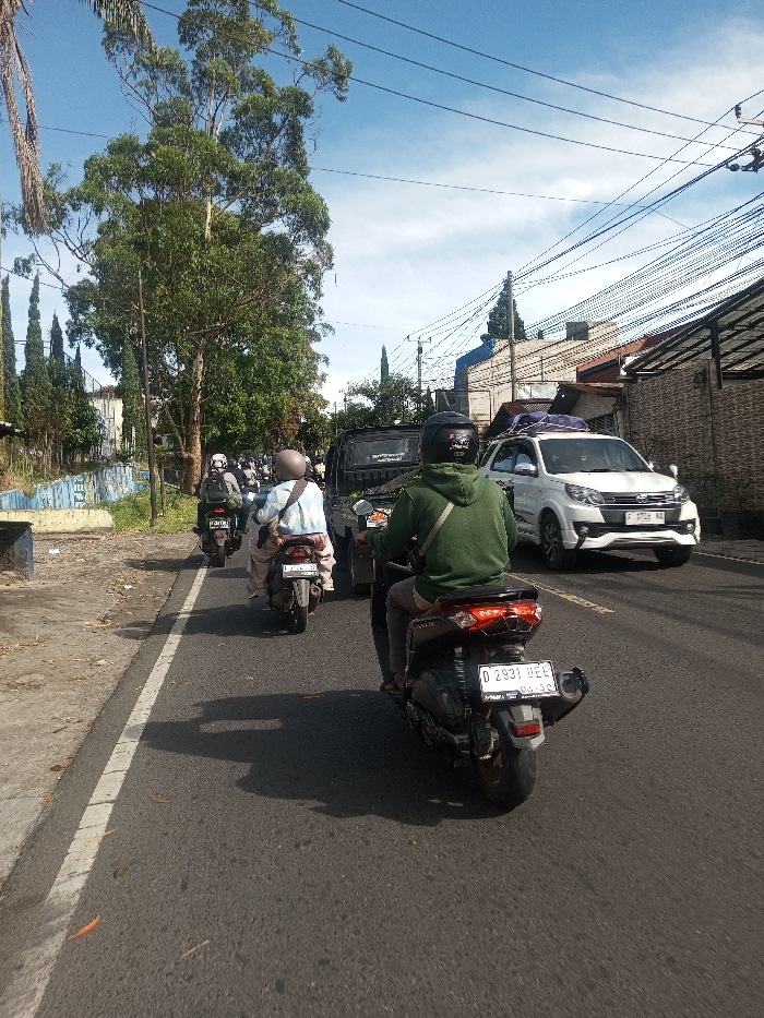 The image captures a street scene dominated by vehicular traffic under a clear blue sky with scattered white clouds. The perspective is from behind a black Yamaha NMAX-type scooter, displaying the Indonesian license plate "D 2931 BEE" with a "01-20" validity tag, indicating a West Java (Bandung region) registration. Ahead of the camera, a line of motorcycles is observed traveling in the same direction. The closest motorcycle in this line is a lighter-colored scooter, bearing the Indonesian license plate "D 6724 AG". All visible motorcyclists are wearing helmets. To the right of this scooter, a dark-colored pickup truck is partially visible, also moving away from the camera. On the right side of the road, a white SUV, consistent with a Toyota Rush or Daihatsu Terios, is present, possibly moving in the opposite direction or stationary. It features a roof rack with items secured by a blue tarp. Its license plate, "F 1726 WA", also indicates a West Java (Bogor/Sukabumi/Cianjur region) registration. The asphalt road surface features a solid white line on the left, delineating a shoulder or a separate lane. Distinct shadows from vehicles and trees are cast onto the road, indicating bright, direct sunlight. The left side of the road is characterized by a blue-painted concrete barrier with graffiti, a grassy verge, and a dense line of trees, including tall, broadleaf specimens and slender conifers. The right side of the road is lined with buildings of varying designs, with numerous overhead utility wires spanning across the sky.