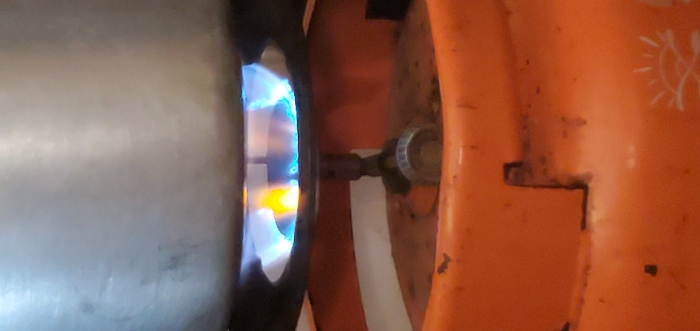 A close-up, vertical photograph taken in Minna, Nigeria, displays a domestic cooking scene. A metallic, silver-colored cooking pot occupies the upper frame, positioned directly over a black circular gas burner. Blue flames with visible yellow tips emanate from the burner, actively heating the pot's base. The burner unit is connected via a metal valve and regulator assembly to an orange-colored liquefied petroleum gas (LPG) cylinder, which forms the lower part of the image. The cylinder exhibits minor surface wear and features a white stylized sun logo on its lower right quadrant. No individuals are present in the frame.