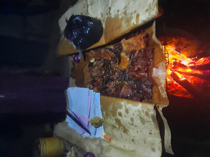 A stacked display with food in the center, possibly barbeque or stew, resting on brown paper. Above the food is a black plastic bag. Below, there are blue-tinted papers, a pair of chopsticks, and a small, round object. The display appears to be near a campfire, which is visible in the background. The area surrounding the display is dark, suggesting an outdoor or nighttime setting.