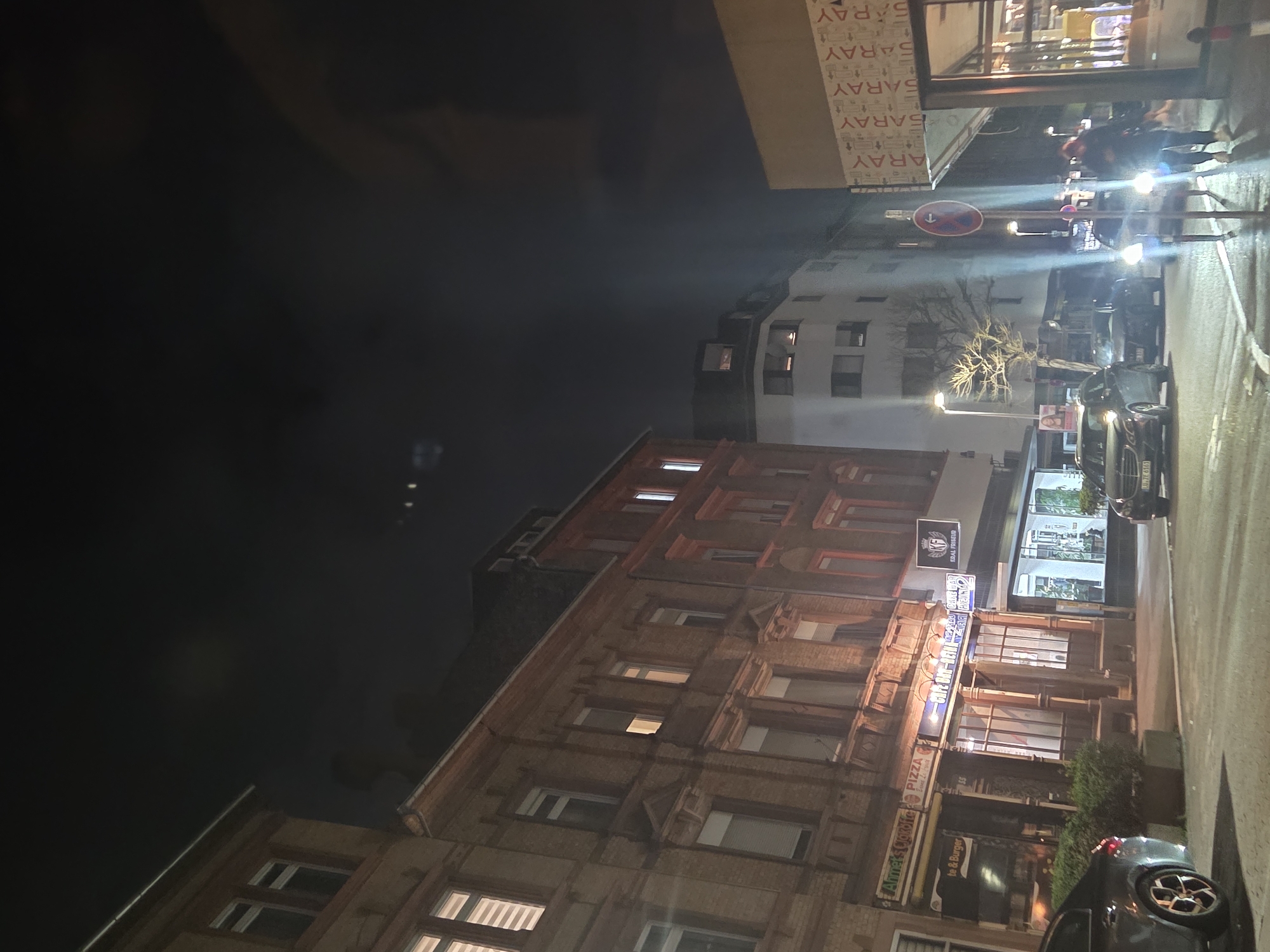n urban street scene at night in Ludwigshafen am Rhein, Germany. The camera faces a cluster of buildings. The street, wet from recent rain, is lined with storefronts on the right, including a pizza place ("Ahmet's"), a burger shop, and a hair salon ("KRAL FRISEUR"). Pedestrians can be seen near a brightly lit store front with "SARAY" repeated in the window. Cars are parked along the right side of the street. Streetlights illuminate the scene. The buildings, predominantly brick, exhibit ornate architectural details. The sky above is dark.