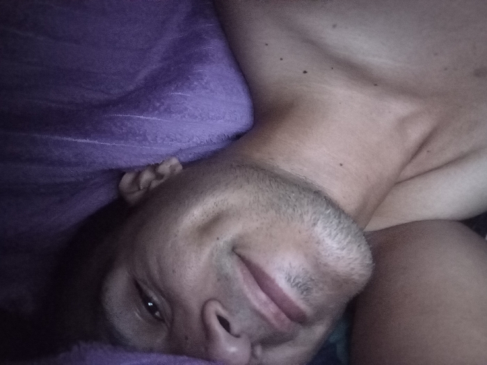 The scene depicts a male individual partially visible, lying down in an indoor setting, identified as being in the city of Flor Amarillo, Venezuela. The individual is positioned on his side, looking towards the camera with a slight smile. He is shirtless, revealing his upper chest, neck, and shoulder, which exhibit a light brown skin tone with scattered small moles. His face, partially obscured by shadow on the left side, shows a short growth of stubble along the chin and jawline. His right eye is open and directed towards the viewer. A purple, textured fabric, consistent with a blanket or sheet, covers a portion of his head and the left side of the frame. The lighting is dim, casting soft shadows.