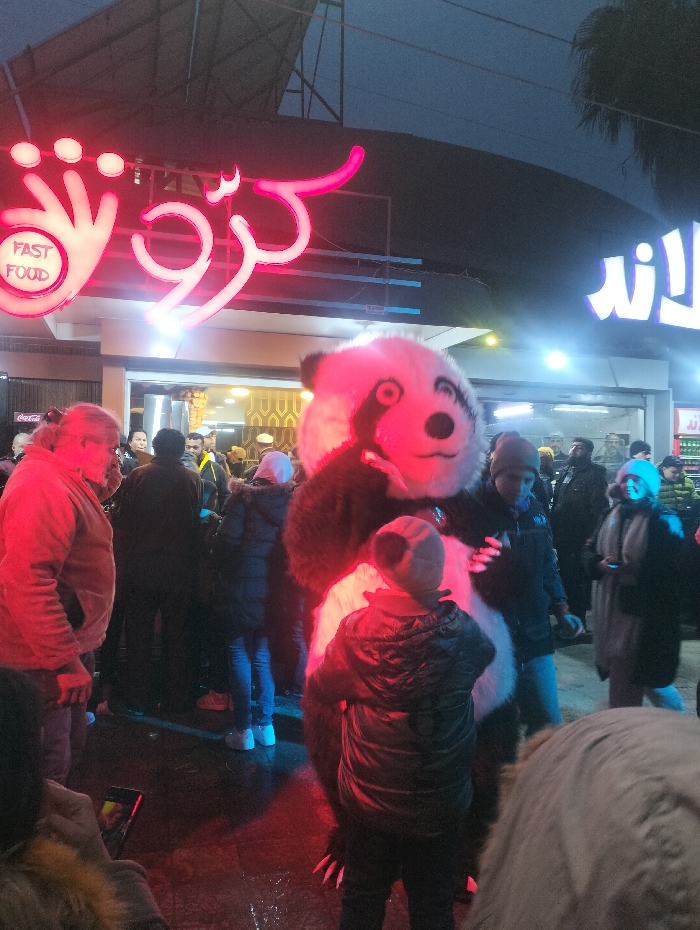 A crowded street scene at night is illuminated by bright neon signs over a storefront. A person in a panda costume stands out in the crowd, with a child in a winter coat standing in front of them. People are gathered around the panda, some holding phones to take pictures. The atmosphere is lively, with a mix of red and white light casting shadows on the wet ground.
