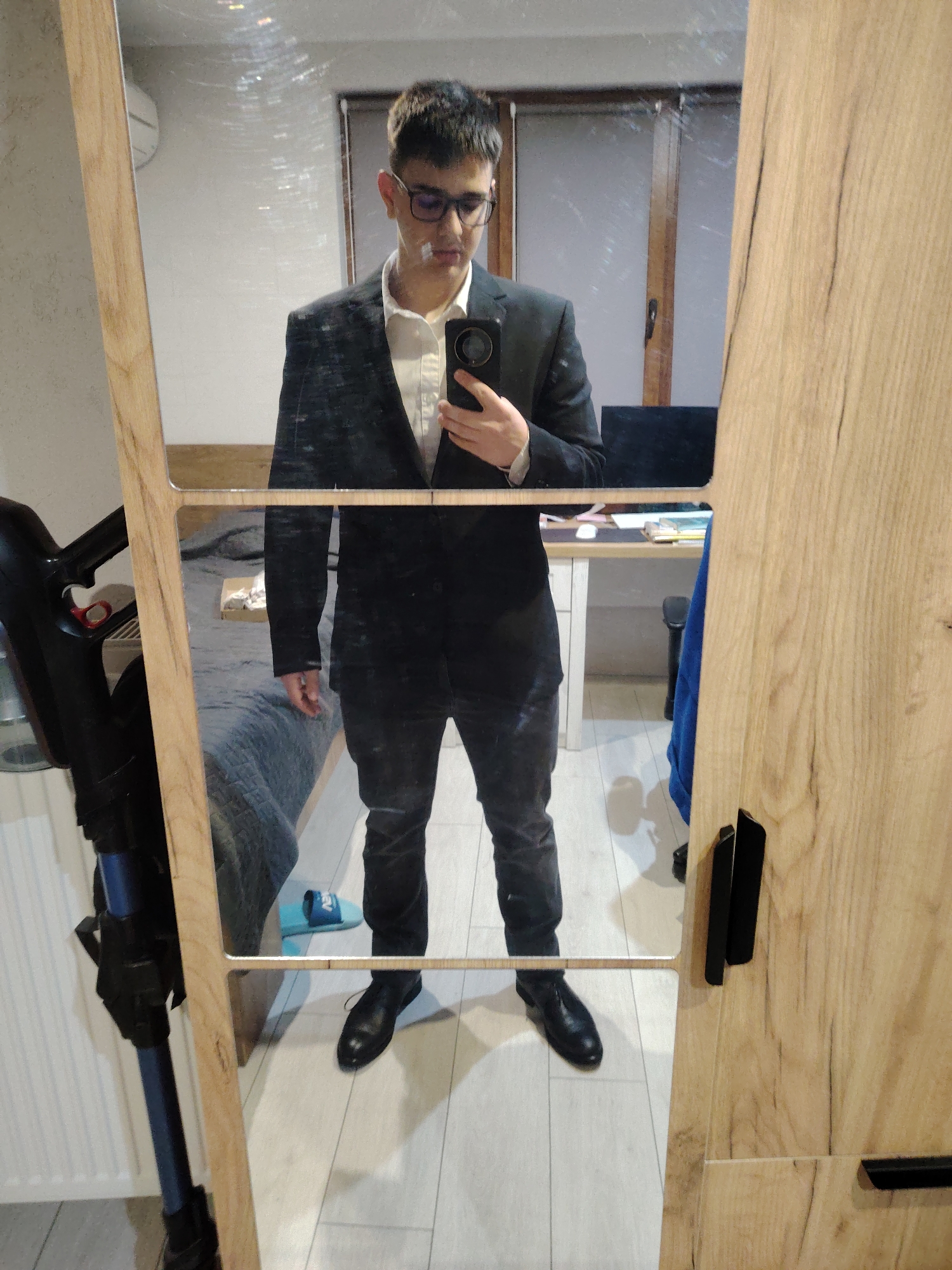 A full-length mirror reflects a person standing in a room. The person is wearing a dark suit jacket, a white shirt, dark pants, and black shoes. The person is wearing glasses and holding a smartphone. The room behind the person contains a bed, a desk, and a vacuum cleaner. The mirror has a wooden frame. Location information, Panagyurishte, Bulgaria, is not discernible from the image.