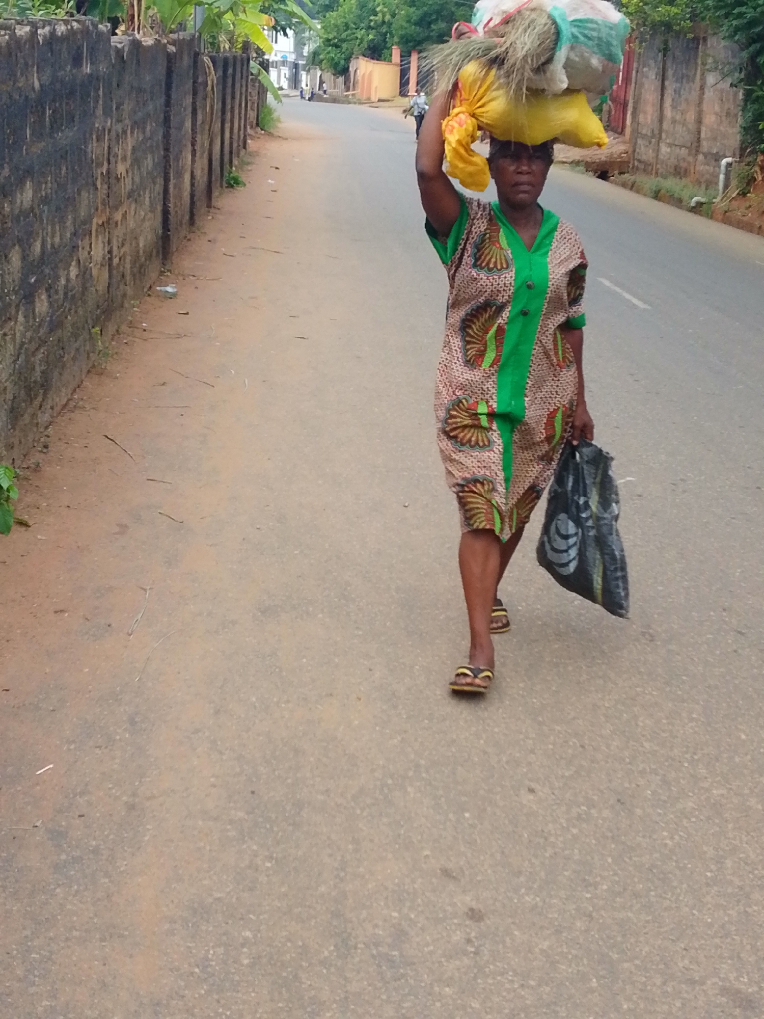 An adult woman is walking on a paved road in Unknown, Unknown. She is carrying a large bundle on her head, including items wrapped in yellow and green fabrics, and a black plastic bag in her hand. She is wearing a patterned dress with green trim and sandals. The road is lined by a weathered brick wall on the left and a shorter wall on the right. The background shows trees and a building in the distance.