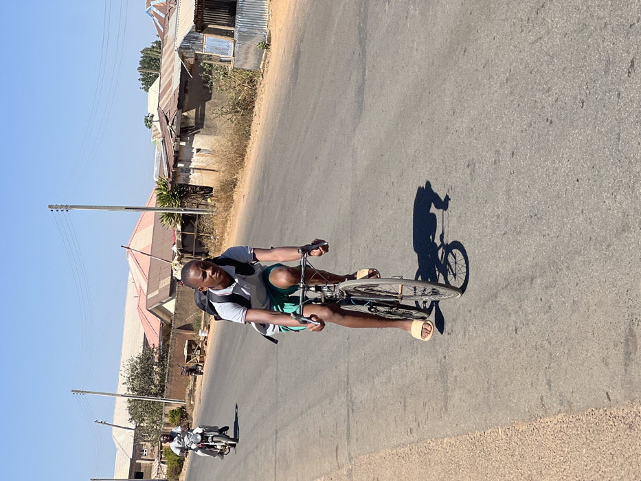 The image displays an outdoor scene on a sunny day in what is identified as the city of Du, Nigeria. A young male, appearing to be in his late teens or early twenties, is centrally positioned, actively riding an older-model bicycle on a paved asphalt road. He is wearing a light grey polo shirt, green shorts, and light-colored slip-on sandals, and has a dark-colored backpack slung over his shoulders. His hands are gripping drop handlebars, and his gaze is directed forward. A distinct long shadow of the cyclist and his bicycle is cast to the right on the road, indicating a high sun position. In the background, further down the road on the left, a second male is visible riding a white motorcycle in the same direction as the cyclist. Utility poles with overhead power lines run parallel to the road on both sides. The surrounding environment consists of various low-rise buildings, many featuring reddish-brown or rusted corrugated metal roofs. The road's edge to the right has an unpaved, dirt shoulder with sparse, dry vegetation. A small, informal structure constructed from corrugated metal and other materials is visible among the buildings on the right side of the road in the middle distance. The sky is clear and blue.