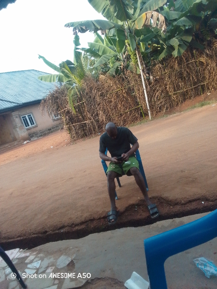 The image depicts a bald, dark-skinned adult male seated outdoors in Aboh, Nigeria