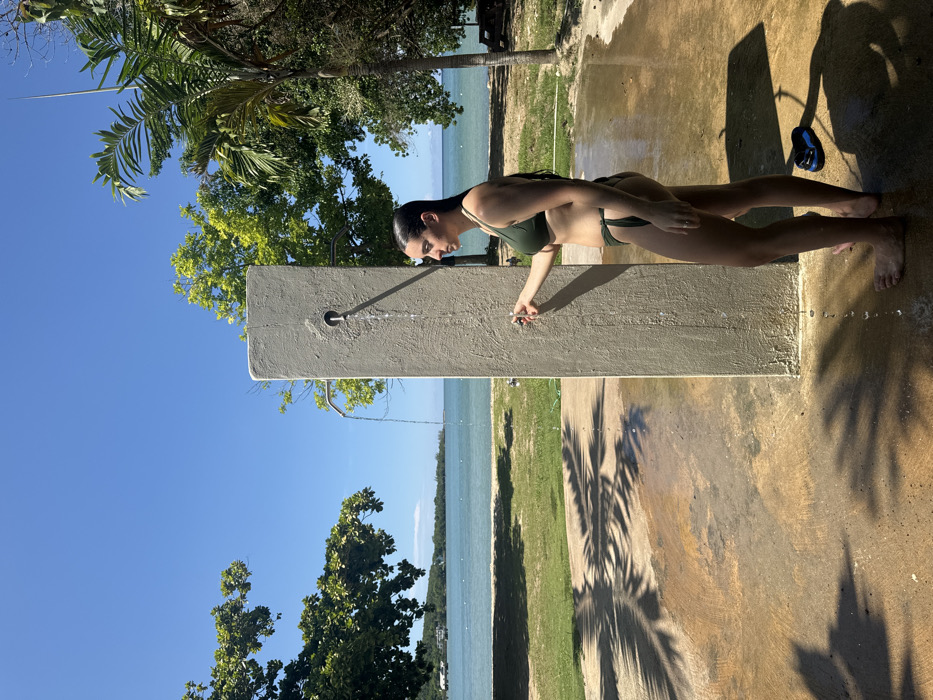 A female subject, viewed in profile from the right, stands barefoot on a wet concrete surface in Rio Bueno, Jamaica. She wears a dark olive green two-piece bikini, and her wet hair is pulled back. Her right hand is extended towards a circular control mechanism on a freestanding, rectangular, light gray concrete outdoor shower column. Water flows from a metal spout on the front of the column, creating a stream that splashes onto the concrete below. Another identical metal spout is visible on the left side of the column. A pair of blue and black sandals rests on the concrete behind the subject. The background features a green grassy area leading to a calm blue body of water, presumably a bay or the sea, with a distant coastline and structures visible under a clear blue sky. Lush green trees and tall palm trees frame the scene, and strong sunlight casts distinct shadows of palm fronds across the concrete ground.