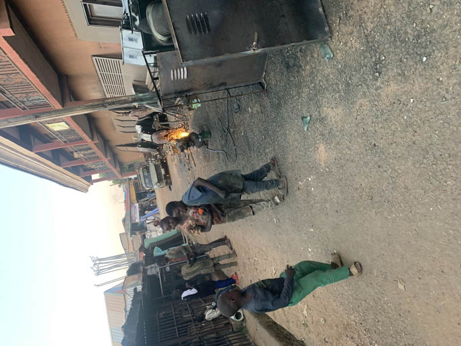 This image captures an outdoor street scene in Jos, Nigeria, featuring active metal fabrication work and numerous individuals, primarily children
