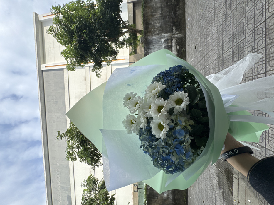 A light-skinned human hand, wearing a dark sleeve and a black wristband with "Walrus" partially visible in white text, holds a bouquet of flowers in the immediate foreground. The bouquet consists of blue hydrangeas and white daisies/chrysanthemums, wrapped in layers of light green and translucent white paper, secured with a white ribbon. The scene is outdoors on a textured paved surface. Behind the hand and bouquet, a low, weathered concrete wall is visible, beyond which stand several green-leafed trees. In the background, a large, multi-story building, primarily light grey and off-white, features horizontal bands and vertical architectural accents. The sky overhead is partly cloudy blue. The image is set in Thủ Đức, Vietnam; however, the precise location or specific identifying landmark within the city cannot be determined from the visual evidence.