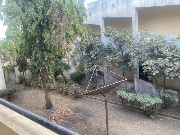 The image displays an outdoor area located in the city of Television, Nigeria. The perspective is elevated, with a dark, possibly metal, railing visible in the lower foreground. The ground is composed of dry earth covered with scattered desiccated leaves and several small accumulations of organic debris. A tall, slender tree with elongated green leaves, some exhibiting brown desiccation, stands prominently on the left-center. Multiple smaller trees and various bushes, some appearing trimmed and arranged in rows along the building's base, are distributed across the scene. In the background, a multi-story concrete building with weathered light-grey surfaces is visible. Its upper facade features several open rectangular apertures, revealing a lighter, possibly yellow-hued interior wall. The lower level of the building presents darker, possibly stained, concrete surfaces with visible screened openings. A rusted, parabolic satellite dish is mounted on a vertical pole in the mid-ground, slightly to the right of center, and is oriented upwards. No individuals are present within the depicted environment.