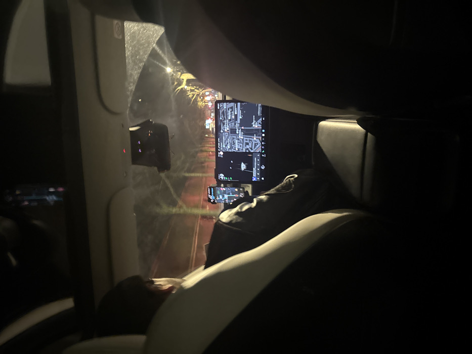 An interior view of a vehicle at night shows a road with streetlights visible through the windshield. A large display screen, likely a navigation system, and a smaller device are affixed to the dashboard. A seat with white accents is partially visible in the foreground, and a dark object rests on the seat. The overall scene is dimly lit, and details are obscured by shadows.