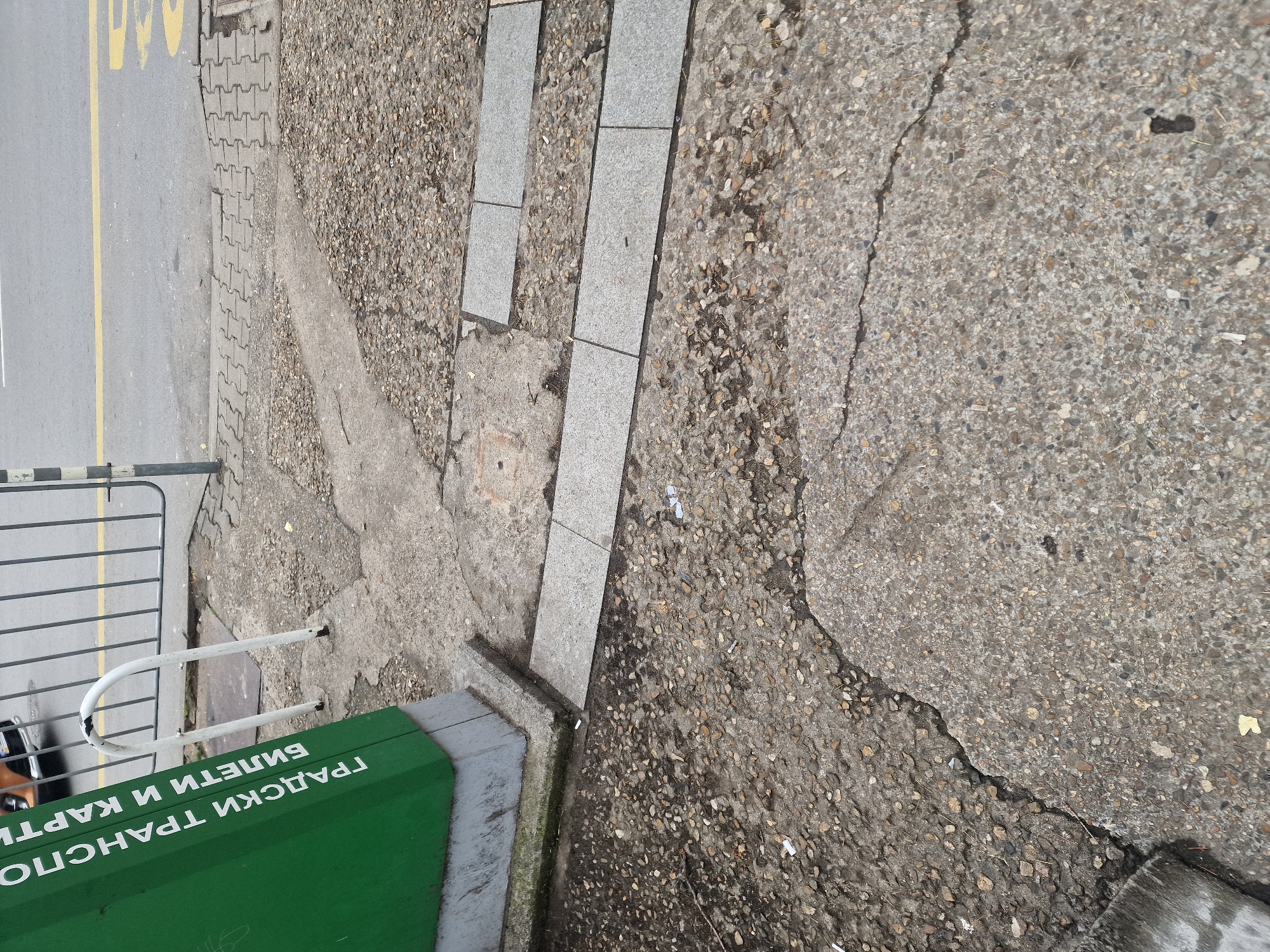 This is an overhead view of a street scene. A sidewalk with a mix of concrete and smaller aggregate surfaces is visible. There are three rectangular paving stones laid out in a line. A green sign with Cyrillic text, possibly a bus stop advertisement, is positioned near the edge of the sidewalk. A metal railing is adjacent to the sign. A yellow-lined road is on the left side. The location is Unknown, Unknown.