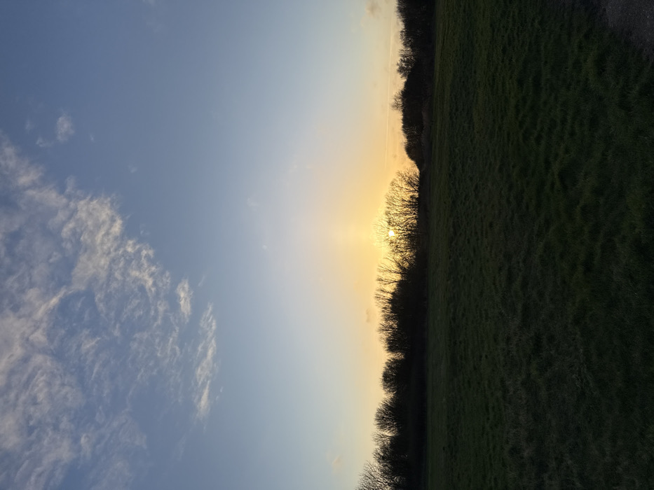 The image displays an outdoor landscape scene located within Great Yarmouth, United Kingdom, at either sunrise or sunset. The sky, occupying the upper two-thirds of the frame, transitions from a clear blue with scattered wispy white clouds in the upper left to a bright yellow and orange hue at the horizon. Centered horizontally, the low sun is partially obscured by and casts light through the silhouetted, bare branches of a dense line of deciduous trees that form a dark band across the midground. The foreground consists of an expansive, dark green grassy field with an uneven surface, occupying the lower third of the image. No people, animals, or man-made structures are visible.