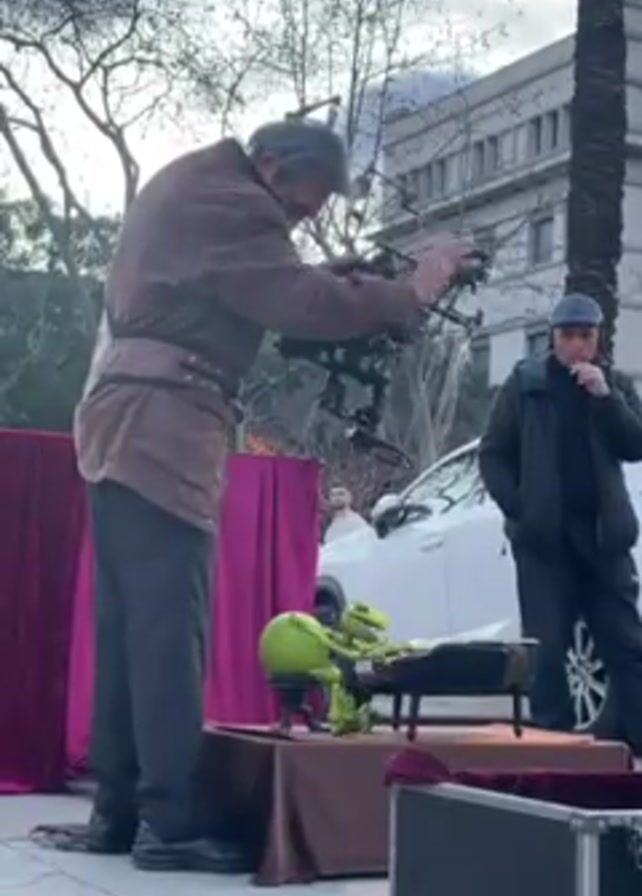 A man wearing a brown jacket, a brown belt, dark pants, and a gray hat stands in front of a table with a small puppet of a green frog playing a miniature piano. The man is operating a camera rig. Another man in a black jacket and a blue cap stands to the side, watching. Behind them is a white SUV, a purple curtain, trees, and a building. The scene appears to be set outdoors on a cloudy day.