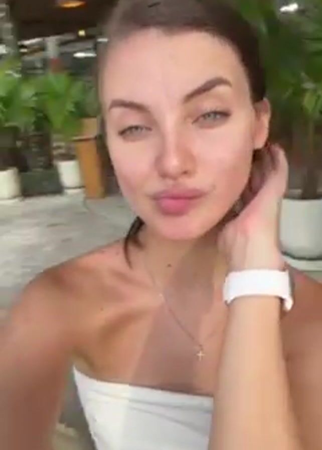 A woman in a strapless white top is outdoors. She is fair skinned with brown hair pulled back in a bun and wears a silver necklace and a white smartwatch. She is looking into the camera and touches her hair. The background is out of focus but shows trees, umbrellas, and people. The video appears to have been taken in a tropical area. A song with a dance beat is playing.
