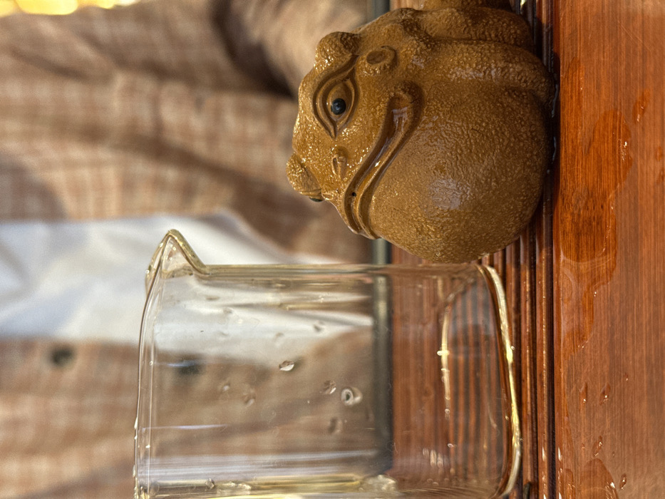 A close-up, shallow depth of field image depicts a tea ceremony setup indoors. In the foreground, a clear glass pitcher with a pouring spout and external water droplets rests on a reddish-brown wooden tea tray composed of parallel slats. To its right, a textured, brown ceramic figurine of a toad or frog, commonly a tea pet, is also situated on the tray. Multiple small puddles and droplets of clear liquid are visible on the wooden surface around both objects. In the blurred background, the upper torso of an individual wearing a light-colored plaid shirt over a white undershirt is discernible. The precise location within Budva, Montenegro, is not ascertainable from the visual evidence presented.