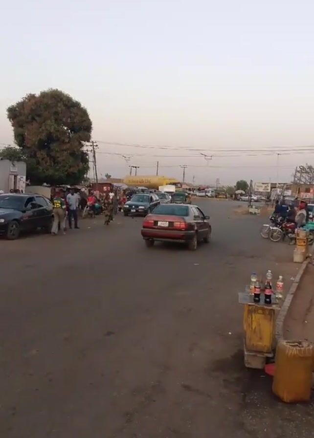 street scene in what appears to be a town in Africa. The time of day seems to be late afternoon or early evening based on the light. Several cars and motorcycles are visible on the road. People are gathered on the side of the road, some standing near a group of vehicles, including a dark sedan and the burgundy car in the foreground. There is a small roadside stand selling drinks on the right. A large tree is on the left side of the frame. Power lines are strung above the street. In the background, a large truck is visible. The overall scene suggests a busy, possibly marketplace or transportation hub.