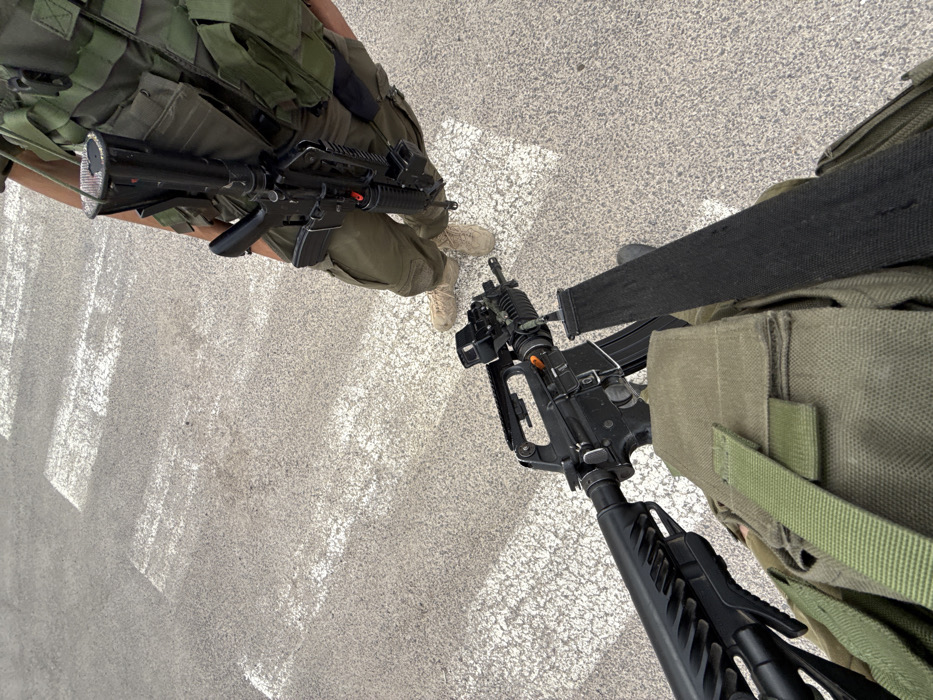 The image depicts a first-person perspective of an individual wearing a military uniform and holding a rifle. The individual's right foot is visible, as well as the left foot of another individual wearing similar attire, also holding a rifle. Both individuals are wearing olive green uniforms with black straps, possibly a shoulder strap and ammunition pouch. The image is taken on a paved surface with a white pedestrian crosswalk in the background. The location is Beit Elazari, Israel, based on the provided coordinates (latitude: 31.85, longitude: 34.817).