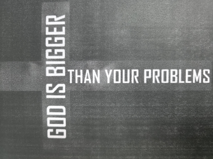 The image displays a dark grey, textured surface, likely textile, featuring a graphic design in the shape of a Christian cross. White, sans-serif capital letters form the message. The horizontal bar of the cross reads "GOD IS BIGGER". The vertical bar, oriented 90 degrees counter-clockwise, reads "THAN YOUR PROBLEMS" from bottom to top. The background material has subtle variations in shade and a visible fibrous or woven pattern, with slightly darker bands defining the cross shape. No individuals, actions, or specific environmental details are discernible within the frame, precluding identification of a precise location in Plovdiv, Bulgaria, or any other city. The scene is static, depicting only the textual graphic on the patterned material.