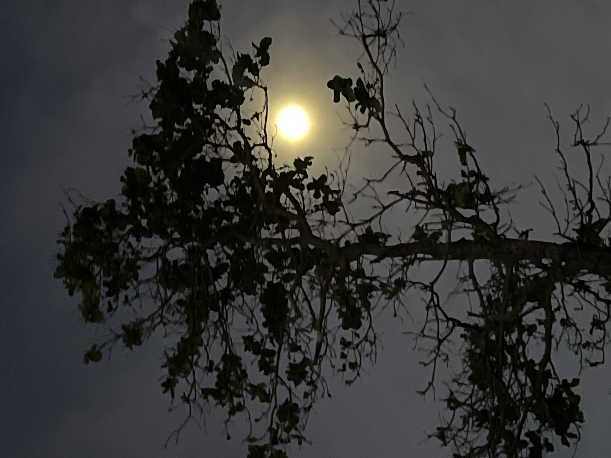 An eye-level, outdoor shot depicts a night scene, likely in Canggu, Indonesia, given the style of vegetation. A bright, near-full moon illuminates a cloudy sky. A tree branch, thicker on the left with leaves and thinner on the right with bare branches, stretches horizontally across the frame. The moon is partially obscured by the tree's foliage and branches. The lighting suggests a humid or overcast environment. No people are visible. The main action is the interaction between the natural elements: moonlight, clouds, and trees.