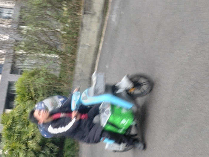 A person is riding an electric scooter on a street. The scooter is blue and white, and the person is wearing a blue helmet, black jacket, and green backpack. There are buildings and trees in the background. The image is blurry, suggesting movement or camera shake. The street appears to be asphalt or concrete.
