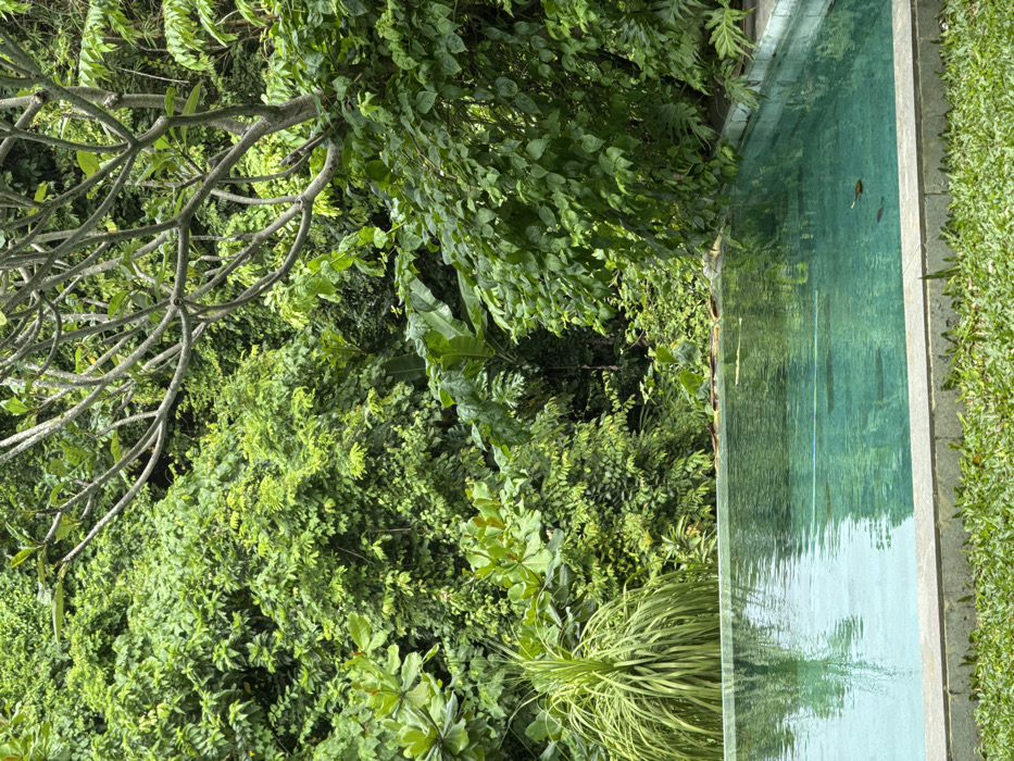 A long, narrow pool of clear, reflective water sits alongside a vibrant, lush landscape. Various shades of green foliage fill the scene, from dense bushes to tall trees. Bare branches of a tree are visible on the left, reaching out amidst the greenery. The pool mirrors the surrounding trees and sky, creating a tranquil and verdant scene.
