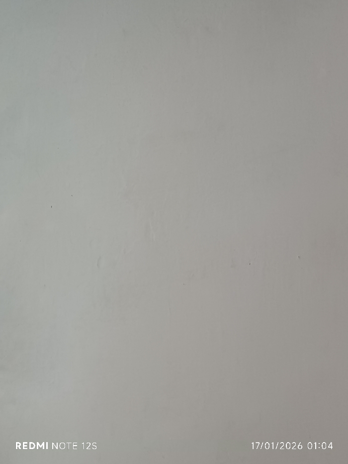 A plain, light gray surface dominates the image, showing minor tonal variations and slight imperfections. Text "REDMI NOTE 12S" is present at the bottom left corner, while "17/01/2026 01:04" is positioned at the bottom right corner, indicating the date and time the image was captured. The surface appears to be a wall or similar flat, solid material, with a slightly textured or uneven appearance.