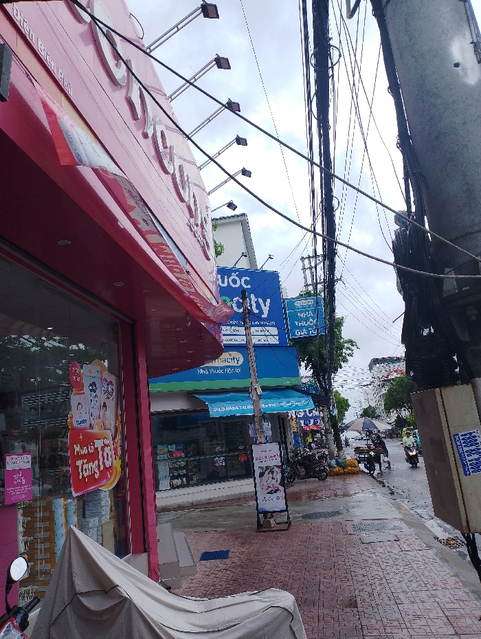 The image displays an urban street scene in Nha Trang, Vietnam, specifically on Điện Biên Phủ street, under an overcast sky, with the asphalt road visibly wet from recent precipitation. In the left foreground, a commercial building with a dominant pink facade features a large sign with white lettering. Several floodlights are mounted on metal arms extending from the building's canopy. A scooter, covered by a beige tarp, is parked on the red-tiled sidewalk in front of this building. Through the glass storefront, various promotional posters and displays, including a red sign stating "Mua là Tặng T", are visible. Adjacent to the pink building, a blue-fronted storefront is identified as "Pharmacity Nha Thuốc Trị Lợi". A vertical A-frame sign stands on the sidewalk nearby. Further down the street, multiple motorbikes are parked. On the wet street, at least two individuals are observed: one person is riding a green scooter moving from right to left, and another individual is standing near a small cart with a dark umbrella open above them. Yellow bundled objects are positioned on the sidewalk next to a parked scooter. The right side of the frame is occupied by a large, concrete utility pole, from which a dense entanglement of black electrical wires and cables extends and crisscrosses across the upper portion of the scene. The background reveals additional urban buildings and vegetation.