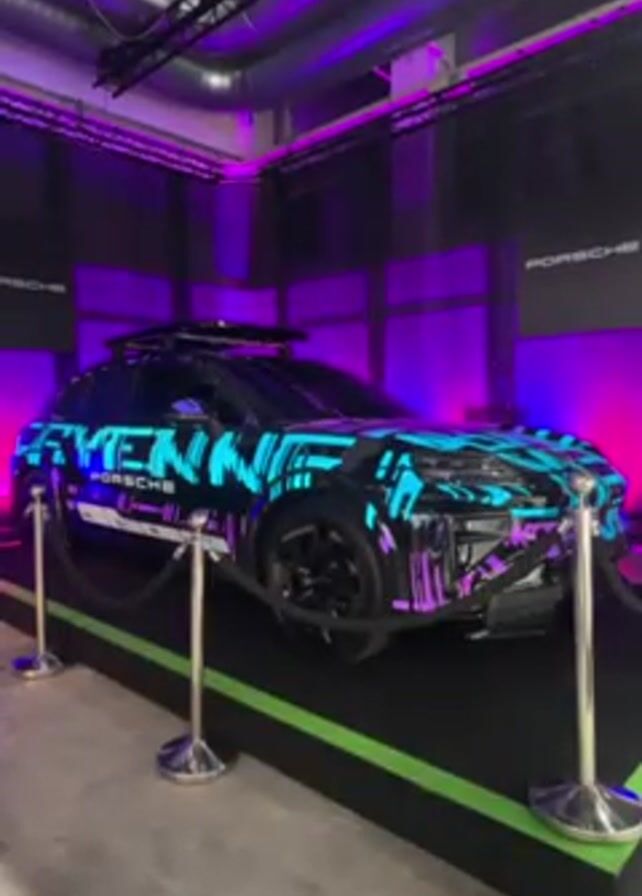 Porsche Macan prototype on display. The car has a psychedelic wrap with the word "Macan" written on it, and a roof rack. It's roped off on a black platform with a green stripe. The background is purple and pink. The room has a high ceiling with exposed pipes and industrial lighting.
