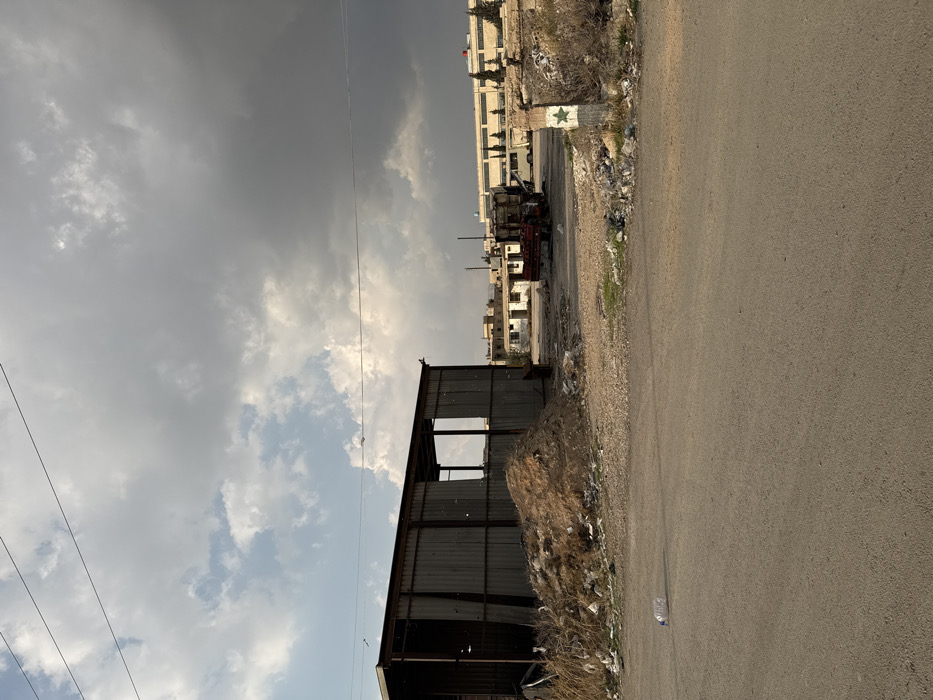 partially destroyed building on a street in Sbeneh, Syria. The building is made of corrugated metal and has a pile of rubble next to it. The street is paved and there is debris and garbage along the side. In the background, there is a row of buildings with a cloudy sky above. The scene is in a state of disrepair, suggesting it has been affected by recent conflict or neglect. The photo was taken in the vicinity of an industrial area in Sbeneh.