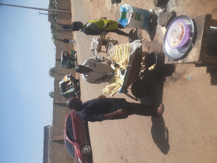 This image captures a bright, sunlit outdoor scene on an unpaved road in Jos, Nigeria